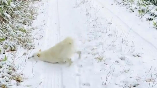 雪が積もった地面に体をスリスリしながら、後ろの両足を使って前進するウパシくん。