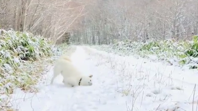 古くからアイヌの人たちと生活を共にしてきたアイヌ犬は寒さに強いことで知られている通り、雪遊びが楽しくて大はしゃぎしている様子のウパシくん。