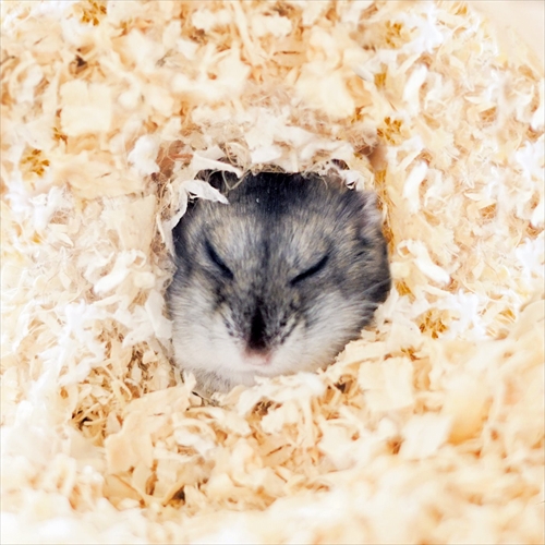 グレーの毛の色がおがくずに映えるのは「ジャンガリアンハムスター」。
