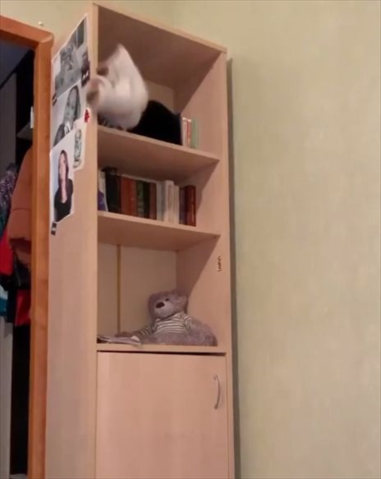 高い棚の一番上までぬいぐるみを運ぶことに成功!ここなら飼い主さんにも見つからないだろうということですね。現場を飼い主さんに動画撮影はされていますが・・(笑)