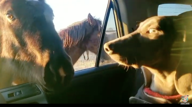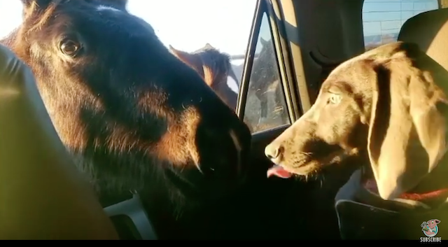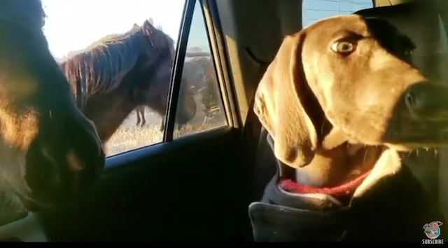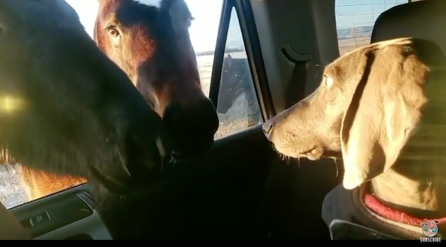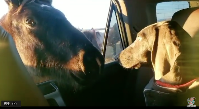 アメリカ、ワイオミング州のララミーで撮影されたこちらの動画。窓の外からニュッと顔を入れてきたお馬さんが、ワイマラナーのワンコをじっと見つめている様子です。