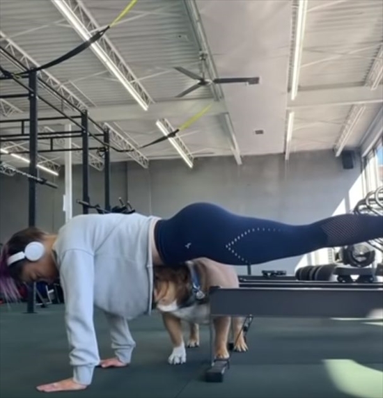 今回ご紹介するのは、飼い主さんがトレーニング中であるにもかかわらず、容赦なく密着するワンコの様子。画的にも凄いことになっていました(笑)