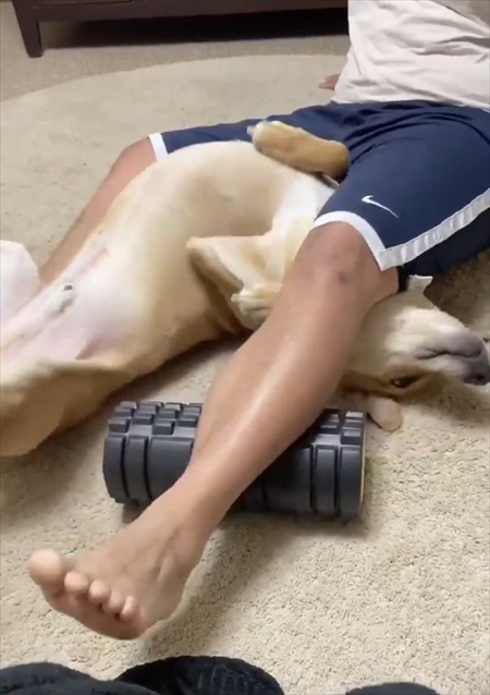 今回Twitterで話題となっているのは、飼い主さんにかまってほしくて、自分までフォームローラーになりきるという献身的なワンコの様子です。