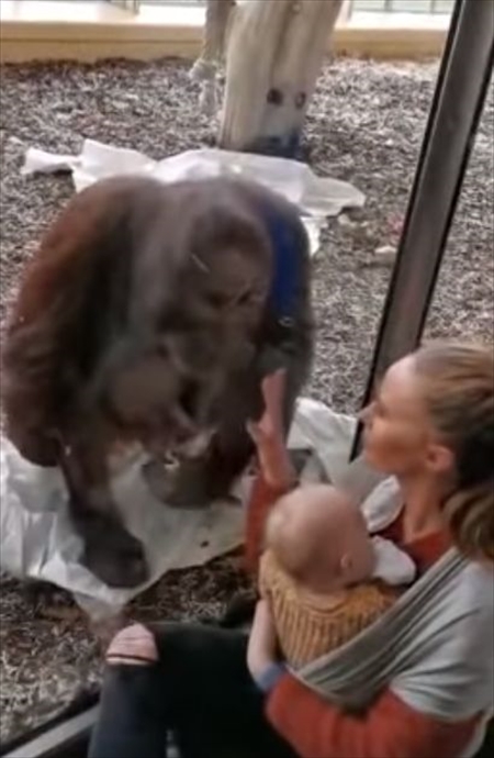 場所はオーストリアのウィーンにあるシェーンブルン動物園。とある母親が息子と一緒に休憩していると、オランウータンがガラス越しに近づいてきました。
