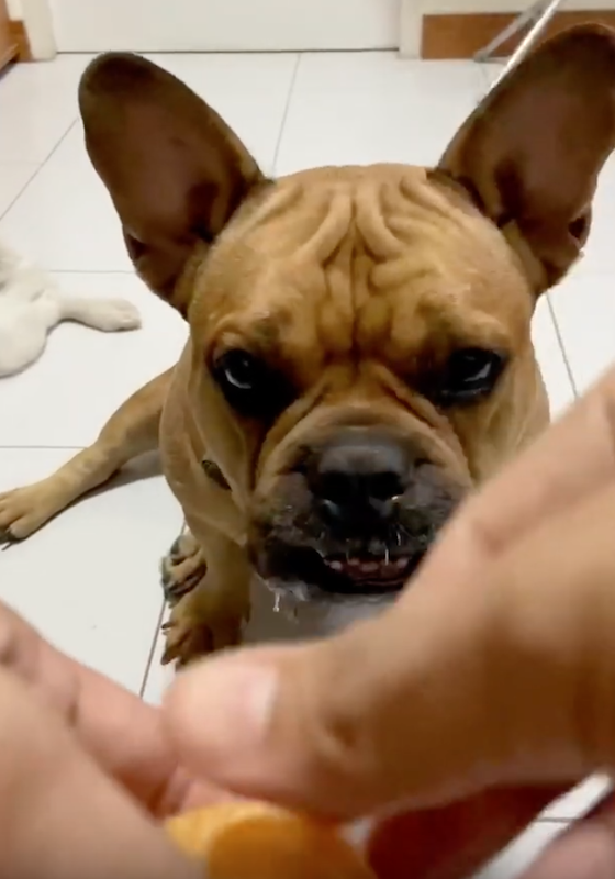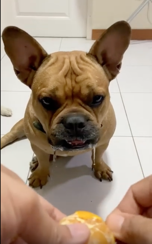 こちらの可愛らしいフレンチブルドッグの表情をご覧ください。オレンジの皮を剥く飼い主さんの手元をじーっと見つめながら、口からよだれが滴り落ちています。