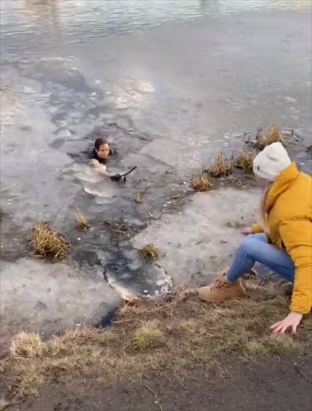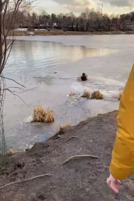 その出来事が起こったのはロシアのモスクワ州ミティシチにある湖。どうやら愛犬はアヒルを追いかけて薄い氷がはった湖に侵入した際、薄氷が割れて湖に落ちてしまったようです。