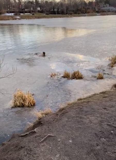 薄い氷をかきわけながら、やっとのことで愛犬のいる場所まで到達。