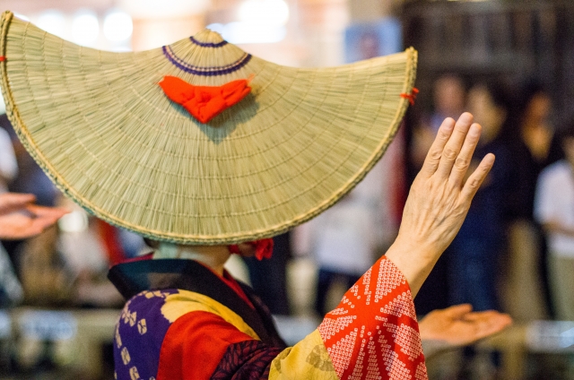阿波踊りは、自由に大きく踊るダイナミックな動きが特徴です。浴衣を着て編み笠をかぶり、下駄を履いて踊るのが基本です。