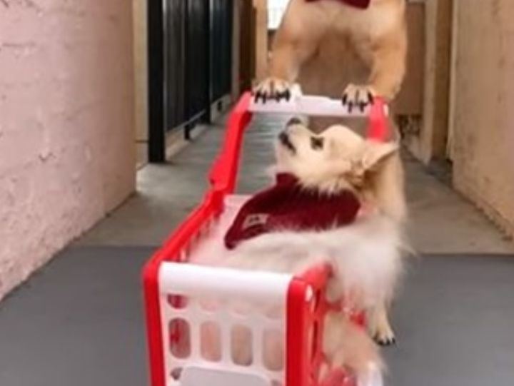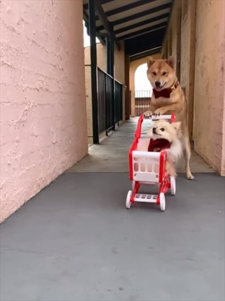 人間の子どもがカートを押すお母さんを見る際に、こういう表情をしたりしますよね。なんとも微笑ましい2匹の関係性にほっこり♪ぜひ動画もご覧ください!