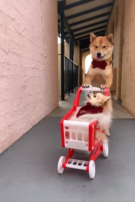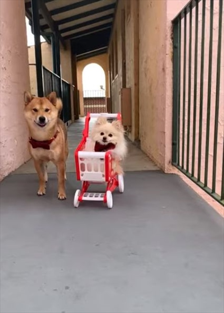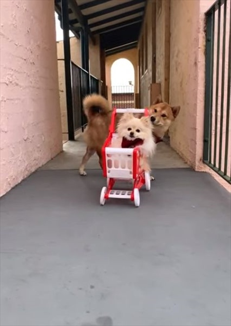 カートが動き始めると、乗っていたワンコも「何だ?何だ?」と言わんばかりに、後ろでカートを押しているワンコを下から見上げます。