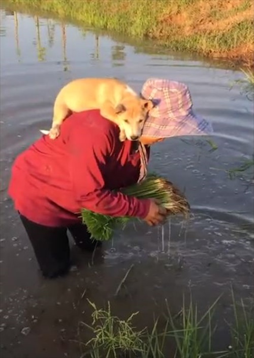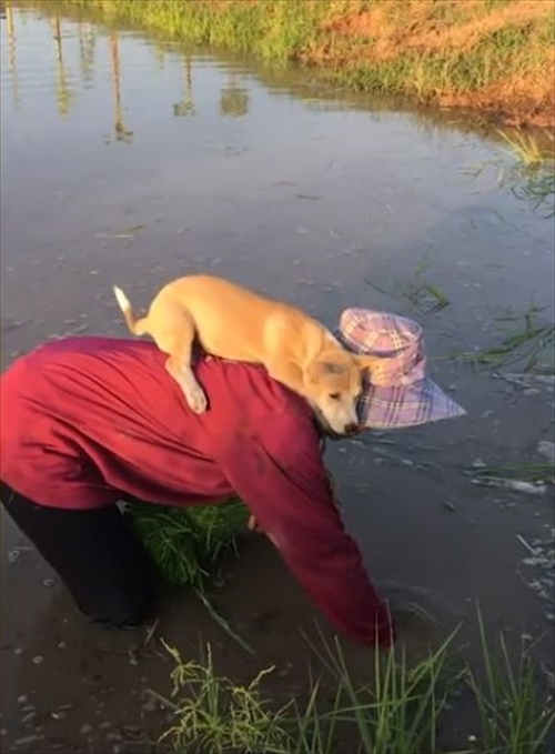 農業を営むニヨム・ドゥアンウォンサさんの背中に乗っているのは、カヌーンという名前の生後5ヶ月の子犬だそうです。
