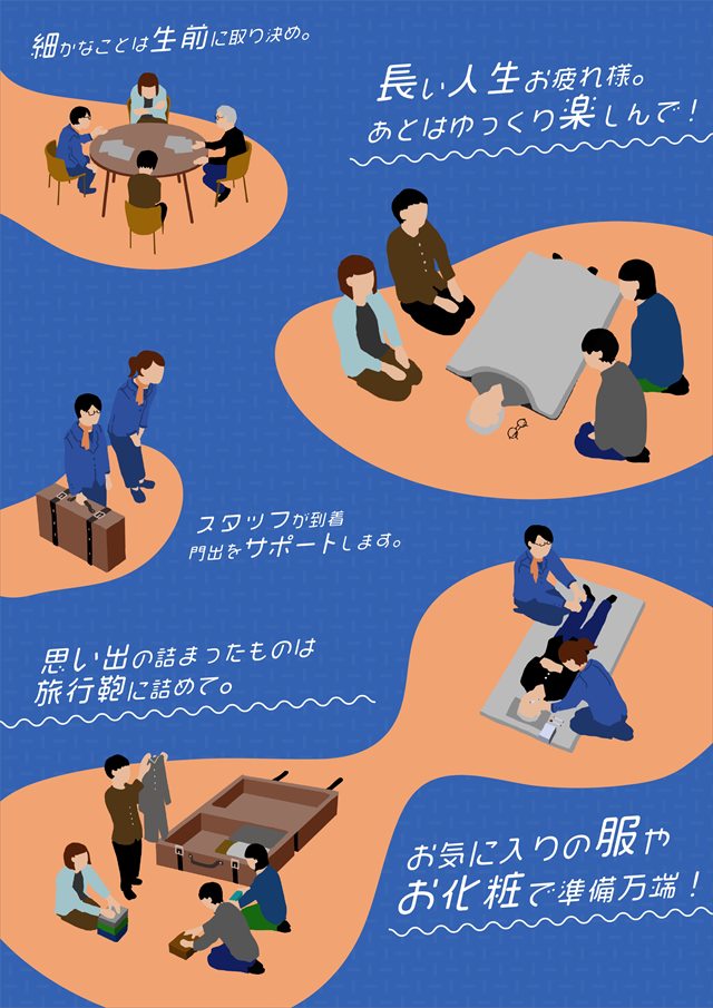 いかがでしたでしょうか!?「明るい葬儀もあってもいい」というコンセプトも素晴らしいですし、「死」を「旅行」と捉える発想の転換が素敵ですよね。