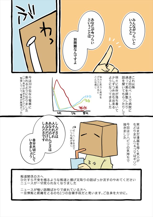 ※ここ数ヶ月の体調不良について、リハビリがてら漫画にしてみました pic.twitter.com/UzeMqscVs3— 環月紙袋?超同人祭「8月8日-10日 超24」新刊委託中?♦✨ (@kanduki_lily) August 6, 2020