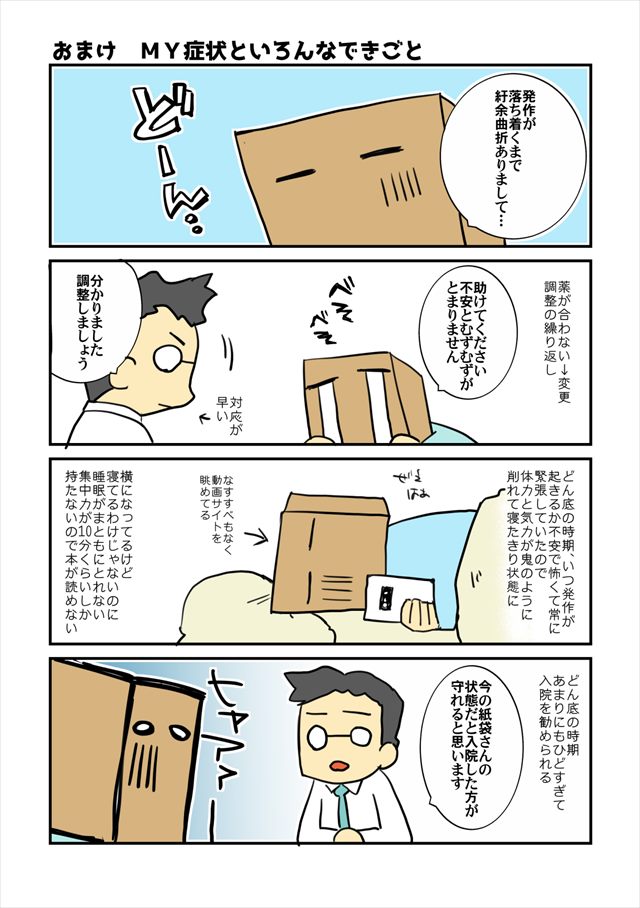 この漫画に対しては、「紙袋様と同じ発作を先日起こし、なんとか今は普通に療養出来ております」と同じ経験をされたという共感の声や、「きっと改善すると思うので、無理なく過ごしてください」と励ます声などが寄せられていました。