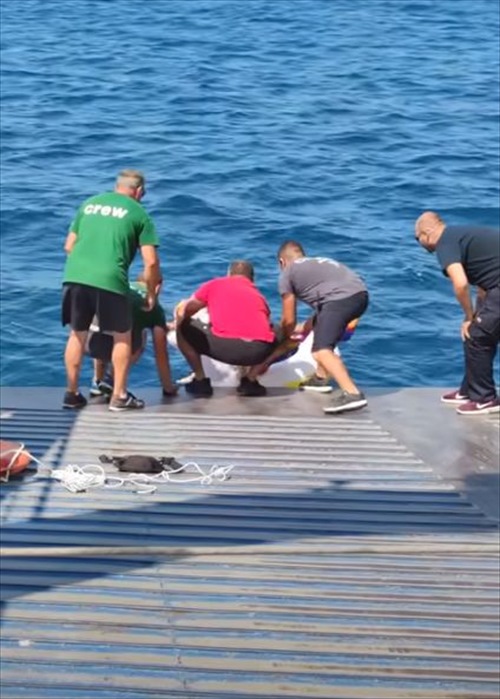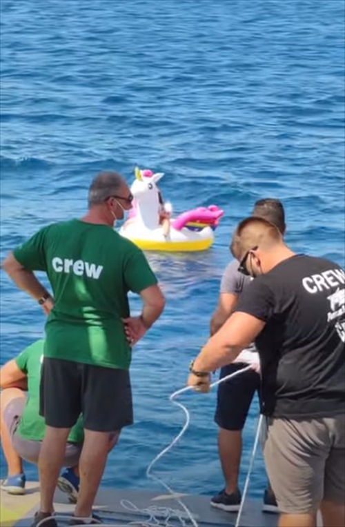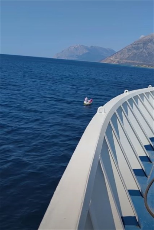 波が穏やかな日で良かったですよね。最後は浮き輪がプカプカと波に揺られながら、フェリーの方に近づいてきました。そして無事に娘さんを引き上げることに成功!