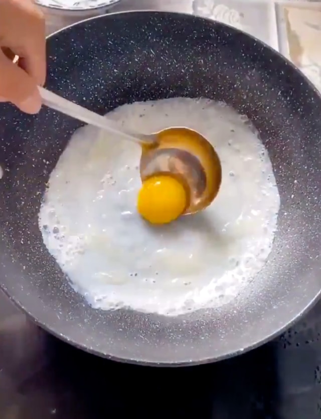 薄く広げた白身にある程度火が通ると、そこに黄身を崩さずに投入。