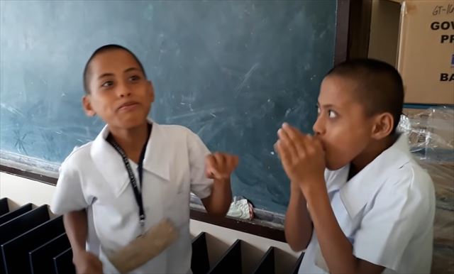 動画では二人は学校でこの技を披露し撮影されたようです。段ボールの名札が何ともいい味を出していますね