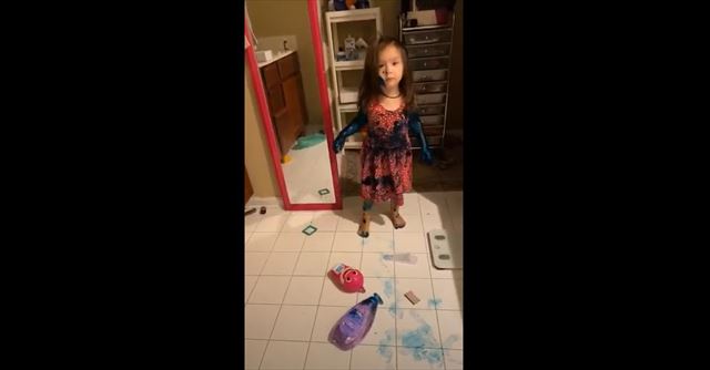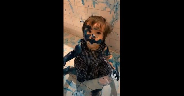 こちらは絵の具!周りも顔も真っ青!派手にやっちまったね。この子は1歳の女の子