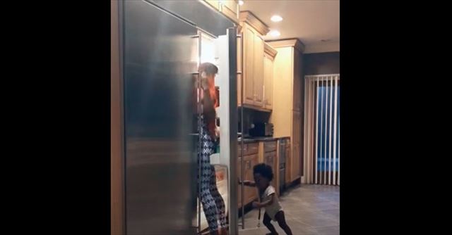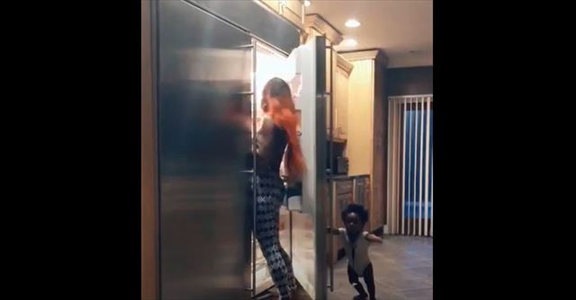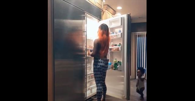 ママが冷蔵庫から何か取り出そうとしている隙にすかさずアタック!