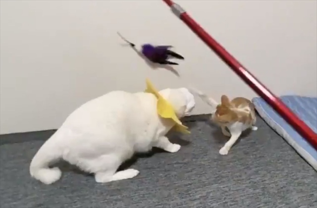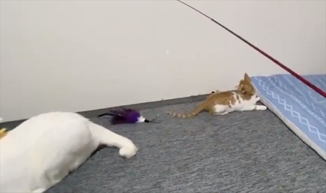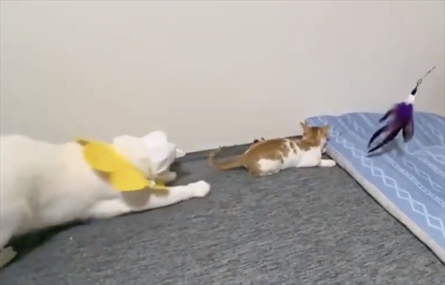 2匹のニャンコがいるところに猫じゃらしを近づけてみたら、まるで漫才のような出来事が発生!(笑)