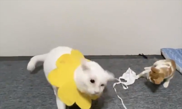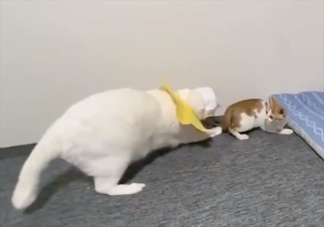 被り物のせいでよく見えなかったのか、生意気な子猫に物申そうとして返り討ちにあったのか