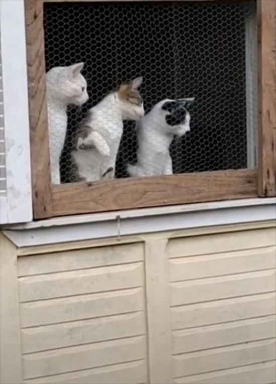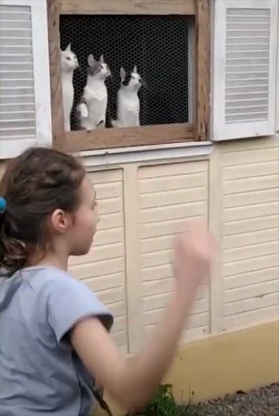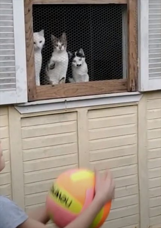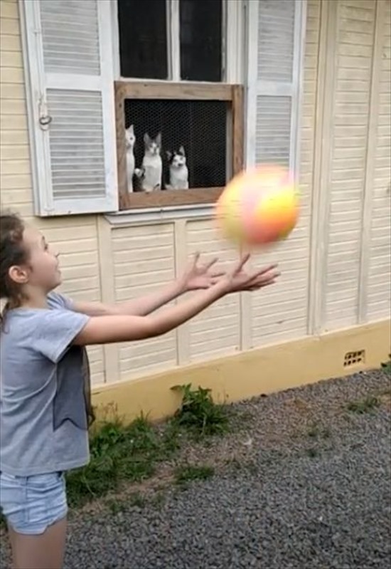 屋外で友達とボールを使って遊んでいるのは、ティファニーちゃん(9歳)。見ての通り、後方の窓には3匹のニャンコが横一列に並び、子供たちのボール遊びを鑑賞しています。