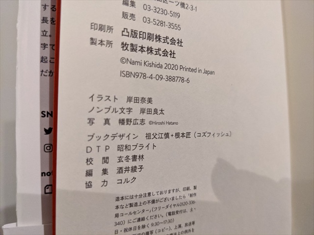 そして、岸田さんの名前のすぐ下に、しっかりと弟さんの名前「岸田良太」が書かれていますね。これは岸田さんだけでなく、ご家族にとっても本当に喜ばしいことですよね!ノンブル文字担当で弟さんの名前を表に出してあげた出版社の方のアイディアもとても素敵だと思います。