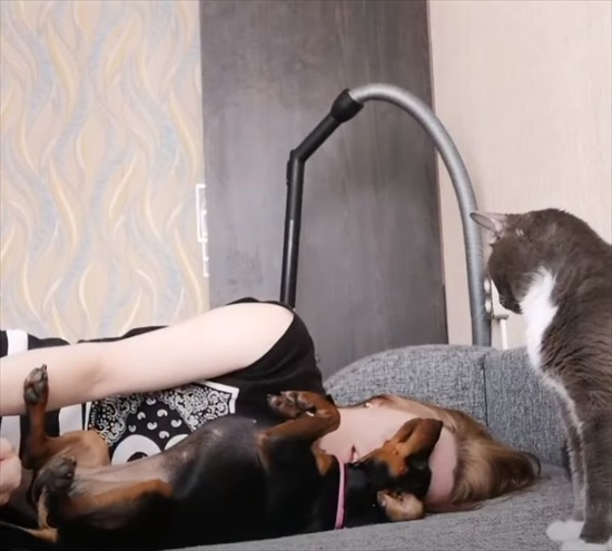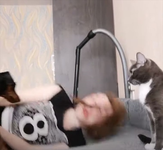 出典:YouTube(Cat and Dog Have Very Different Reactions to Fallen Owner)