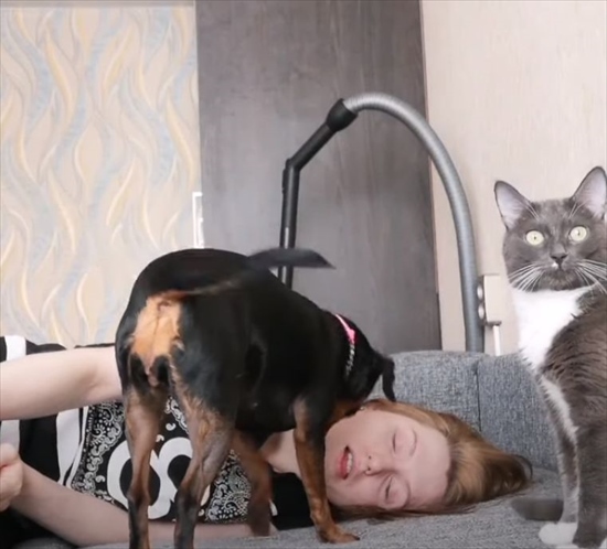 ロシアのムルマンスク州で暮らしているワンコとニャンコ。飼い主さんの女性は、この後に意識を失うフリをしてベッドに倒れます。