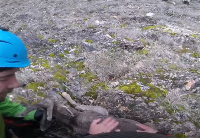 長時間にわたって川に流され、体が冷たくなり体力を消耗していたと予想されるシカ。引き上げた後、ぐったりとしていたので男性がシカの体を温めるようにさすっています。