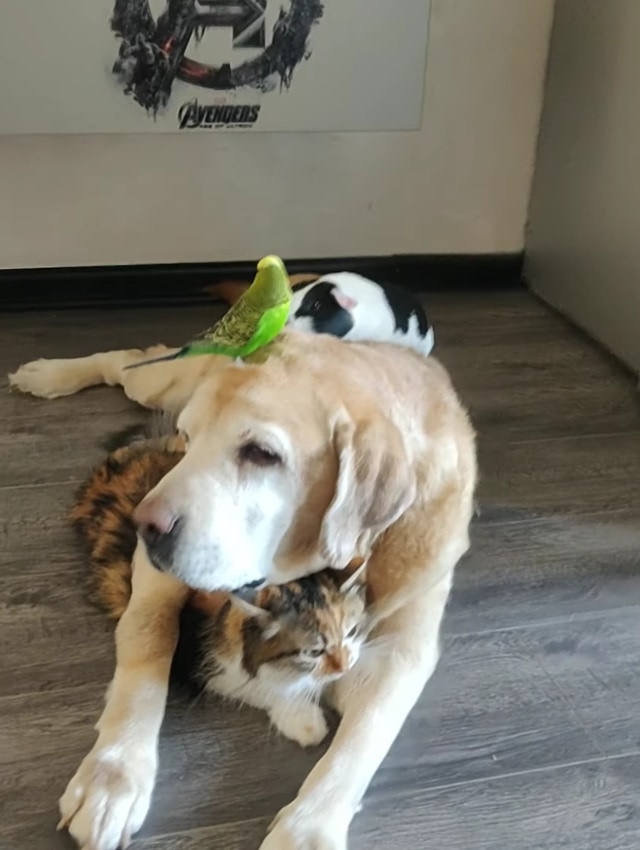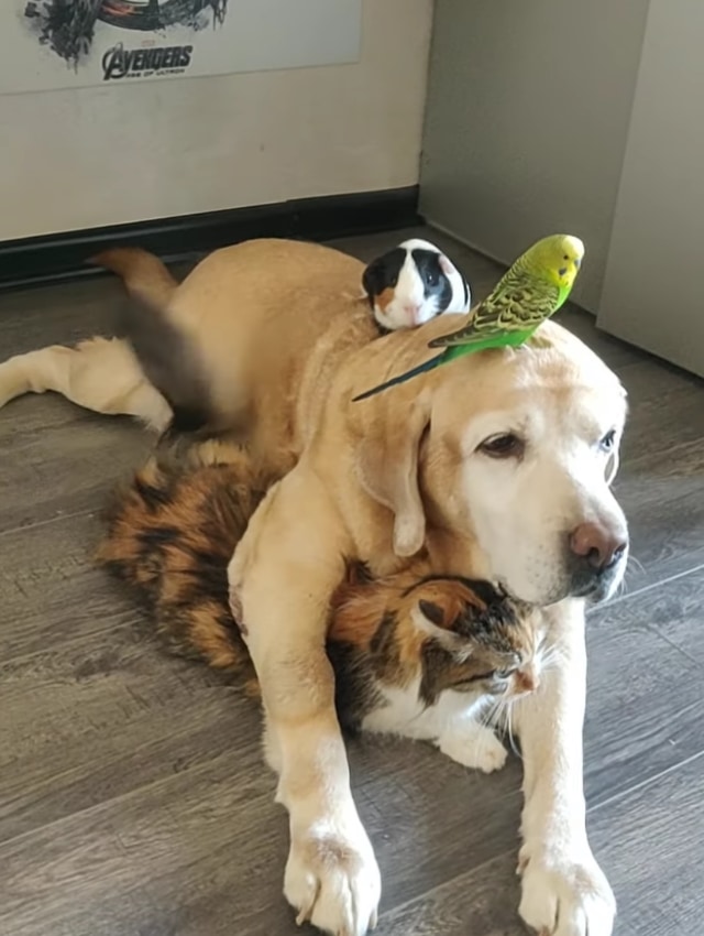 種の異なるお友達が縦に積み重なり、心地よさそうにリラックスする姿が面白かわいくて自然と笑顔になっちゃいました。飼い主さんにとっては、この上なく愛おしい光景ですよね。