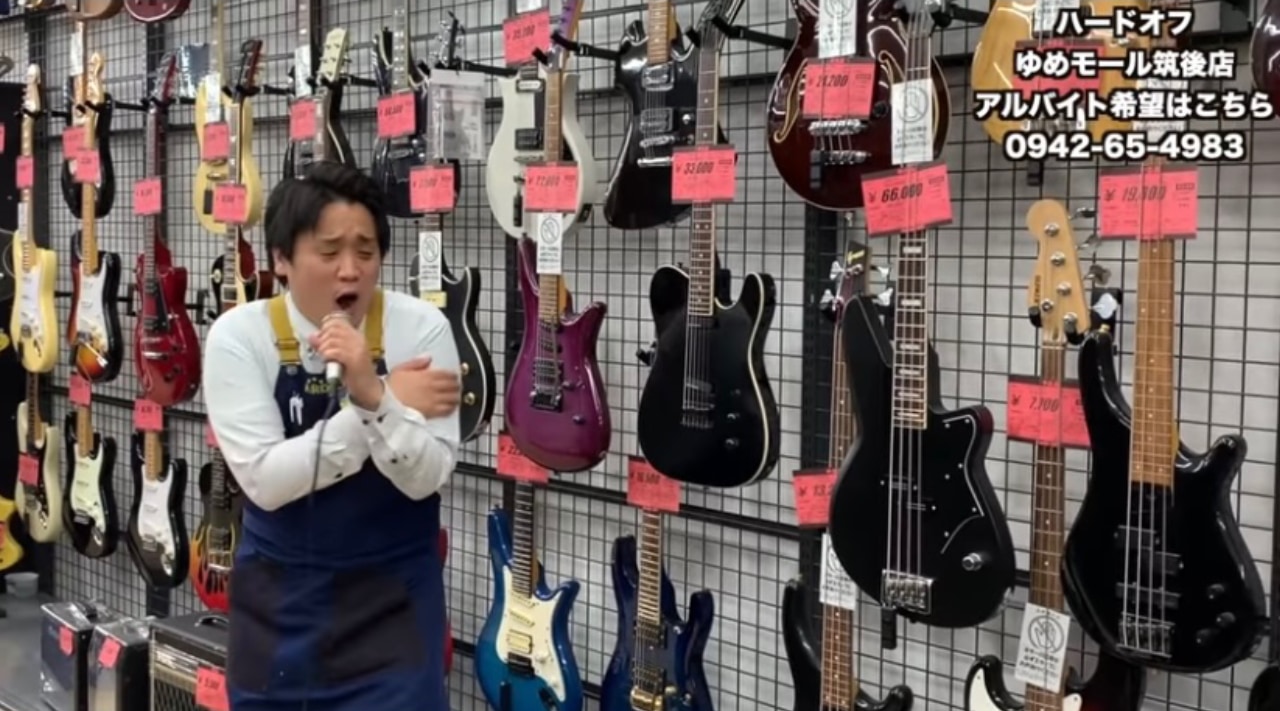 ライブ会場はハードオフ店内。そこで分身した永田さんが歌と楽器をノリノリで奏でます。