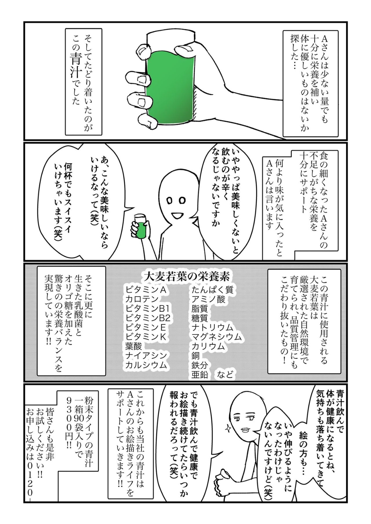 漫画のはじまりは、ある一人のしがない絵描きがTwitterに絵を投稿する中で感じるようになった辛さの描写。ここから絵描きがどう乗り越えたのか感動的な結末が待っているんじゃ・・・と思いきや、青汁のCMかーーーい!!