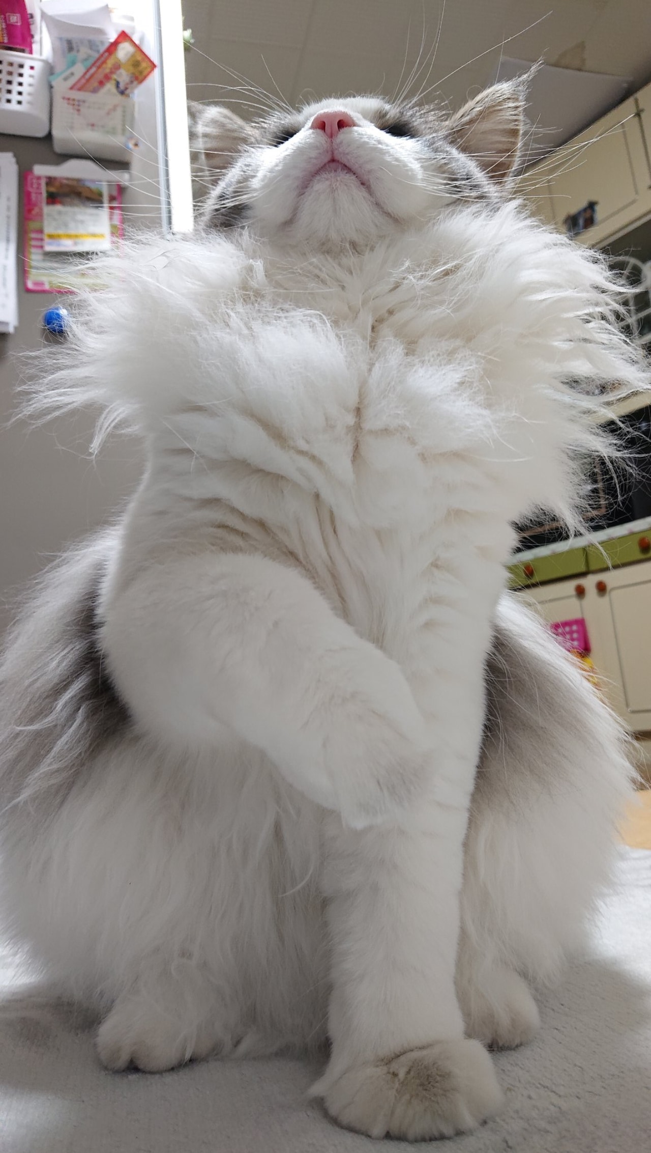 Twitterユーザーたんたん(@mEEB5usHvBLcvt1)さんの愛猫・ノルウェージャンフォレストキャットの「炭治郎」くんも冬に備えてか、”胸元の毛”をゴージャスに装った姿が注目を集めています。
