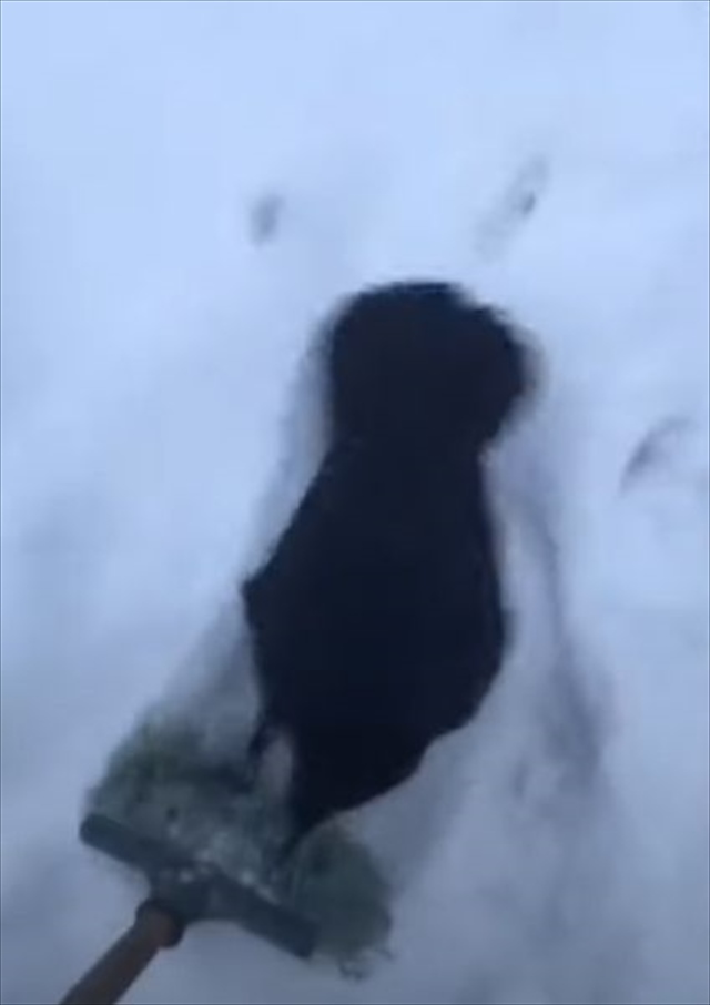 その後、男性がモップをカラスから引きあげると、カラスは雪の上でコロコロと少し転がります。なんだかとっても楽しそう(笑)