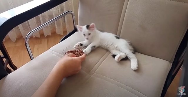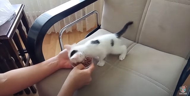 大好きなキャットフードのにおいを感じた子猫は凄まじい瞬発力で起き上がるとご飯にがっつきます。
