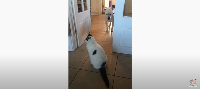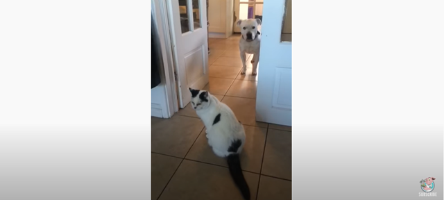 今回ご紹介するのは、大好きな飼い主さんの所に行きたいけれど猫に邪魔されて一歩が踏み出せないワンちゃんの動画。