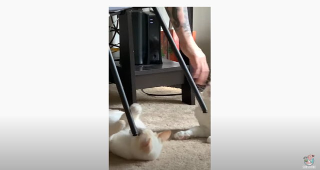 今回ご紹介する動画は、飼い主が座る椅子の足に異常な興味を示す二匹の猫とそれに困る飼い主を撮影したものです。