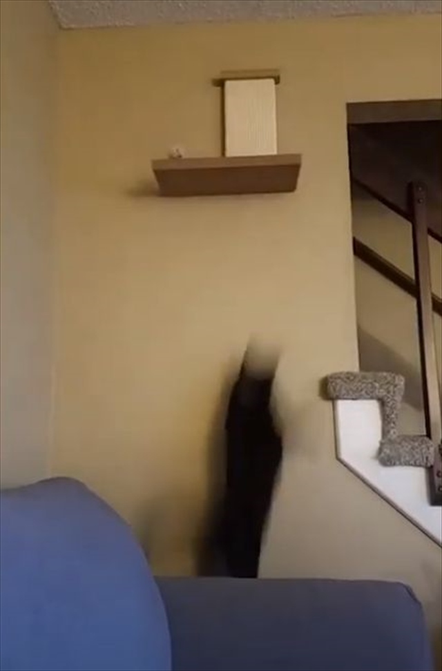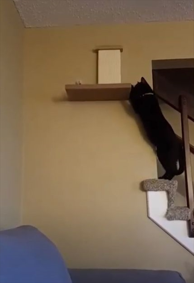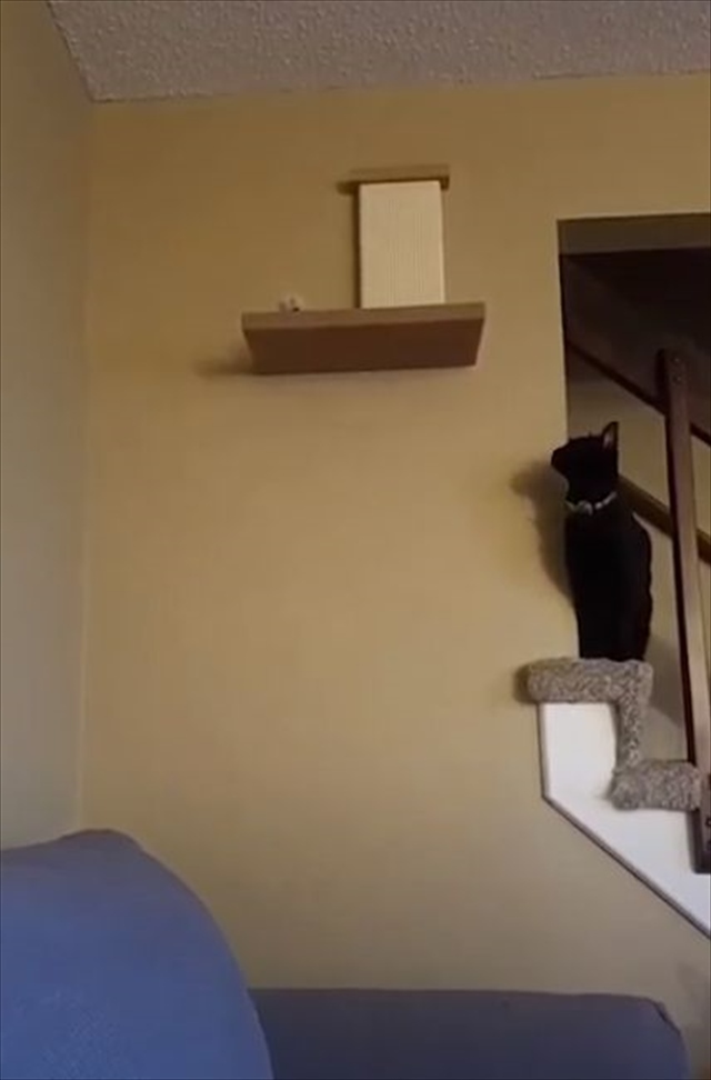 撮影されたのは、米カンザス州オレイサのとあるご家庭。ニャンコの名前はモチ(1歳)です。階段の隣りにある高い棚をじっと見上げています。