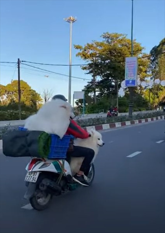 サモエドは荷台だけでなく、バイクを運転している方の足下にも!2匹のサモエドを乗っけていたのですね。