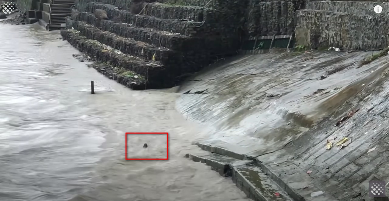 川に転落した子牛ちゃんは濁流に流されなされるがまま。
