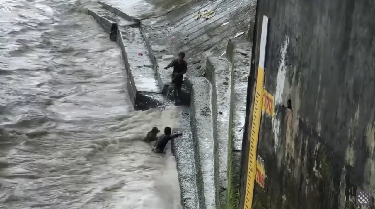 男性は川に転落してしまいましたが直ぐに子牛の救出に向かいます。体をしっかりつかみ堤防付近まで引き寄せると、もう1人男性が救出に向かい男性と子牛を引き上げます。