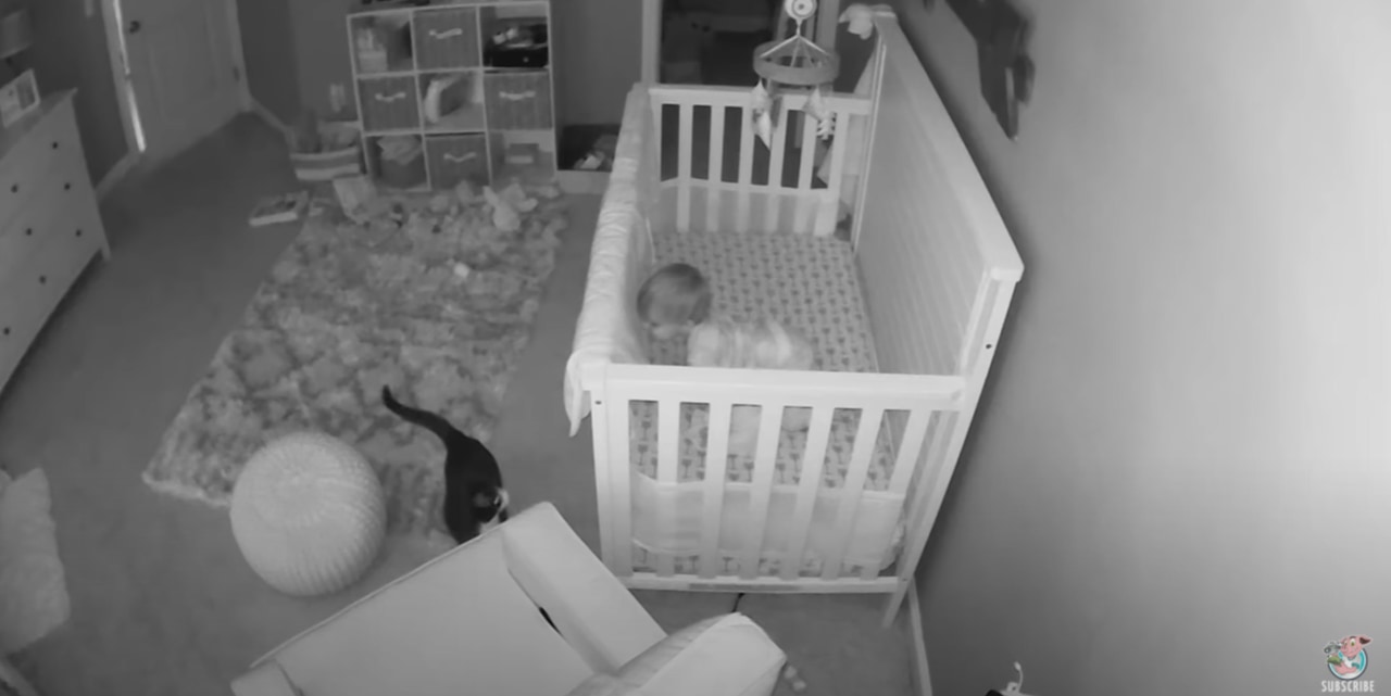 お母さんとお父さん曰く赤ちゃんを寝かしつけて部屋を出たつもりだったようですが、その後にやってきたのは飼っている猫ちゃん!