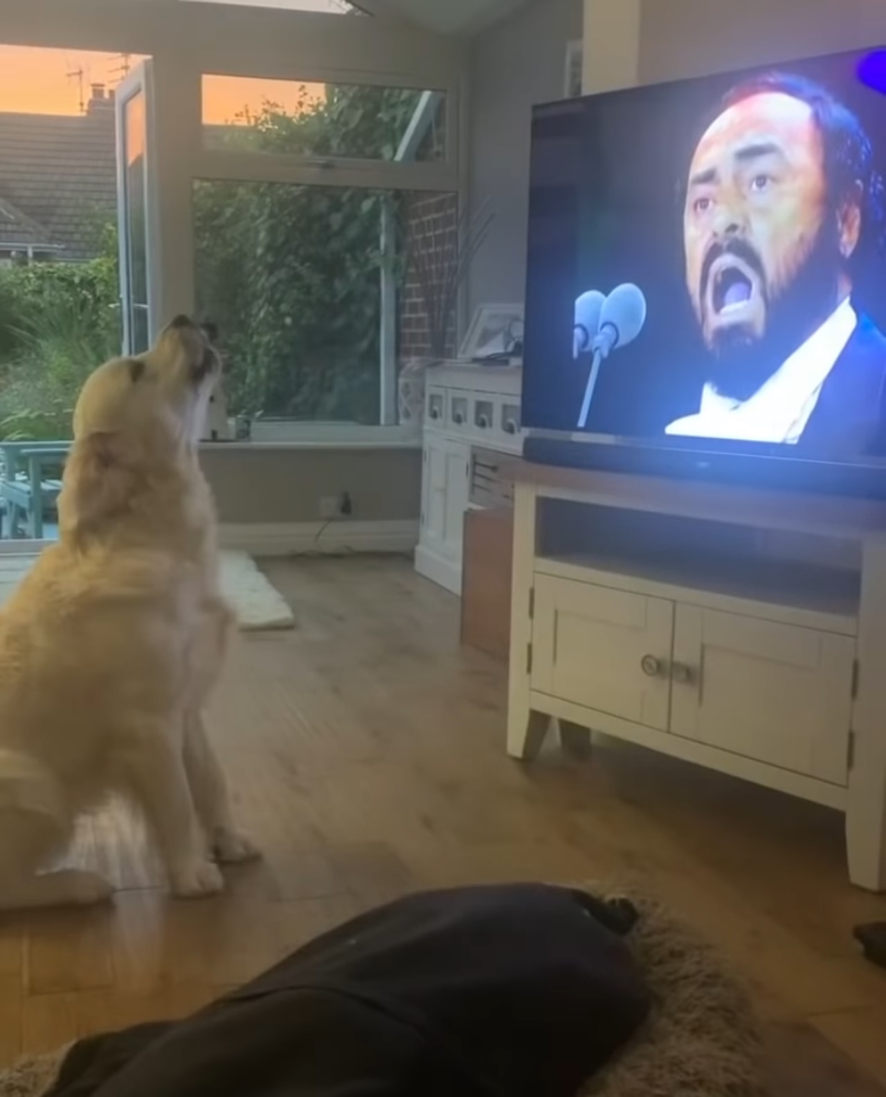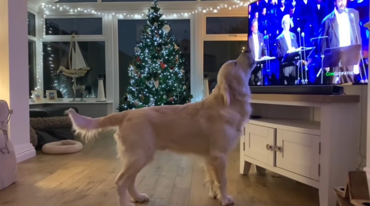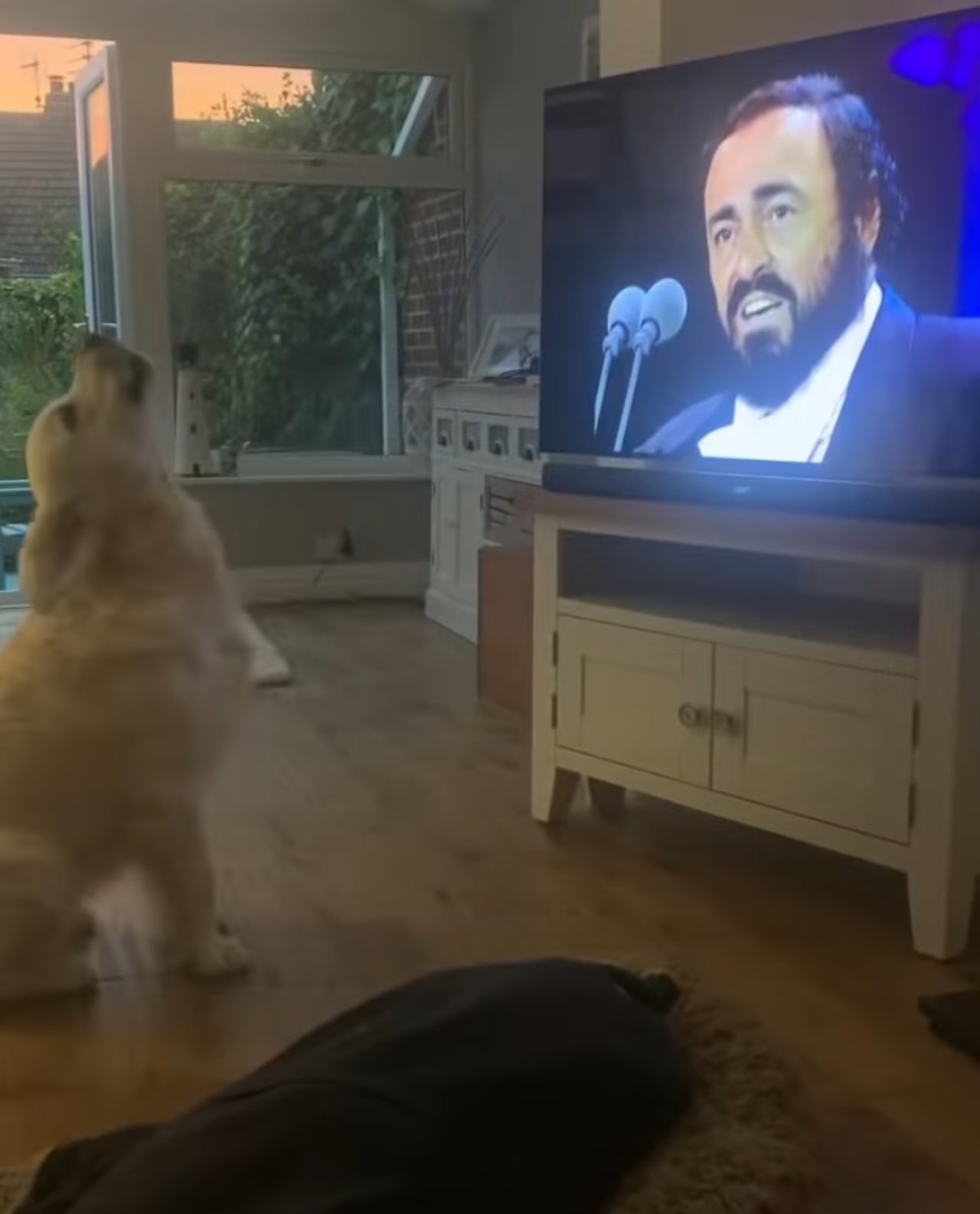 テレビの前に慌てて駆け寄ってきたヒューゴは、嬉しそうに尻尾を振りながらパヴァロッティさんの歌声に耳を傾けます。