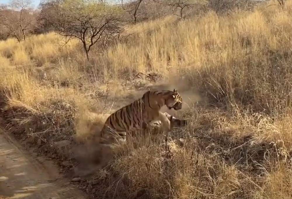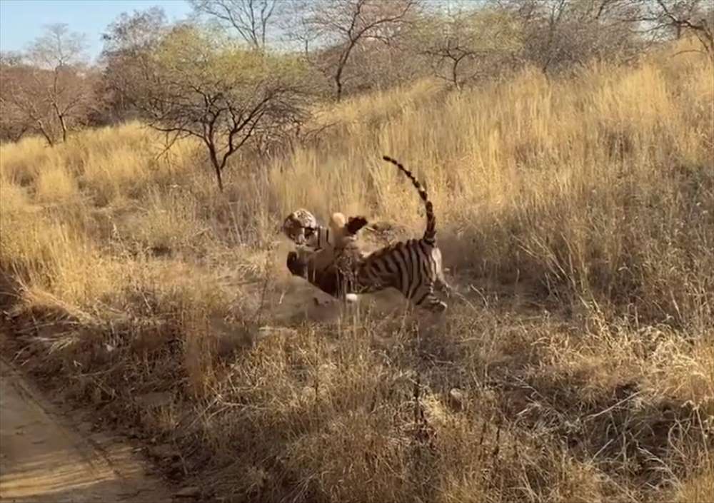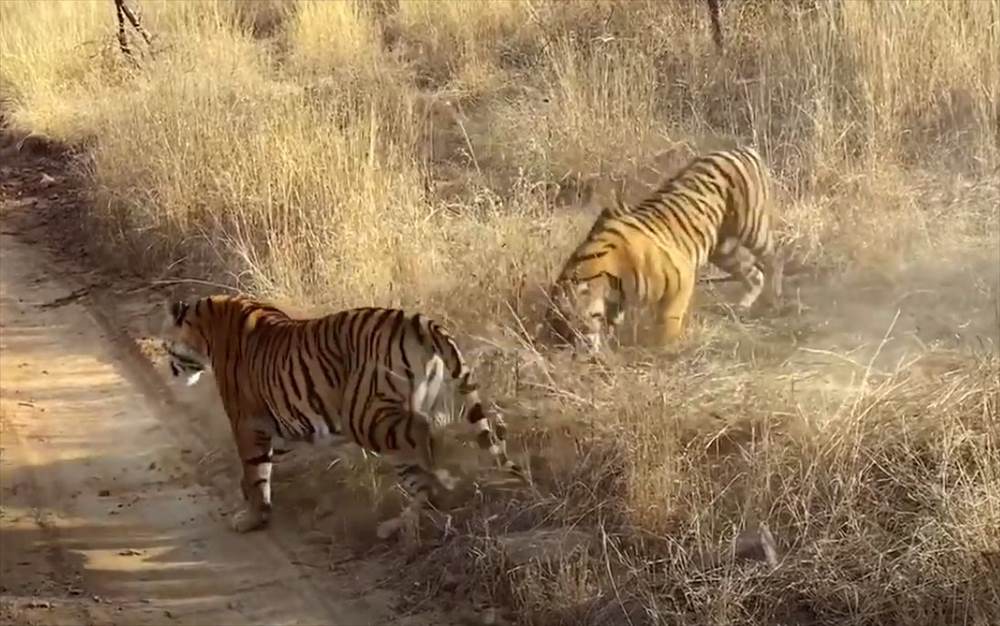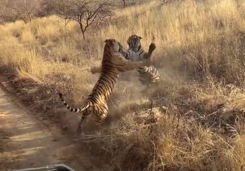 撮影者がサファリジープに乗っていると、すぐそこにいた2頭のトラが立ち上がり、激しい格闘を始めたのです!