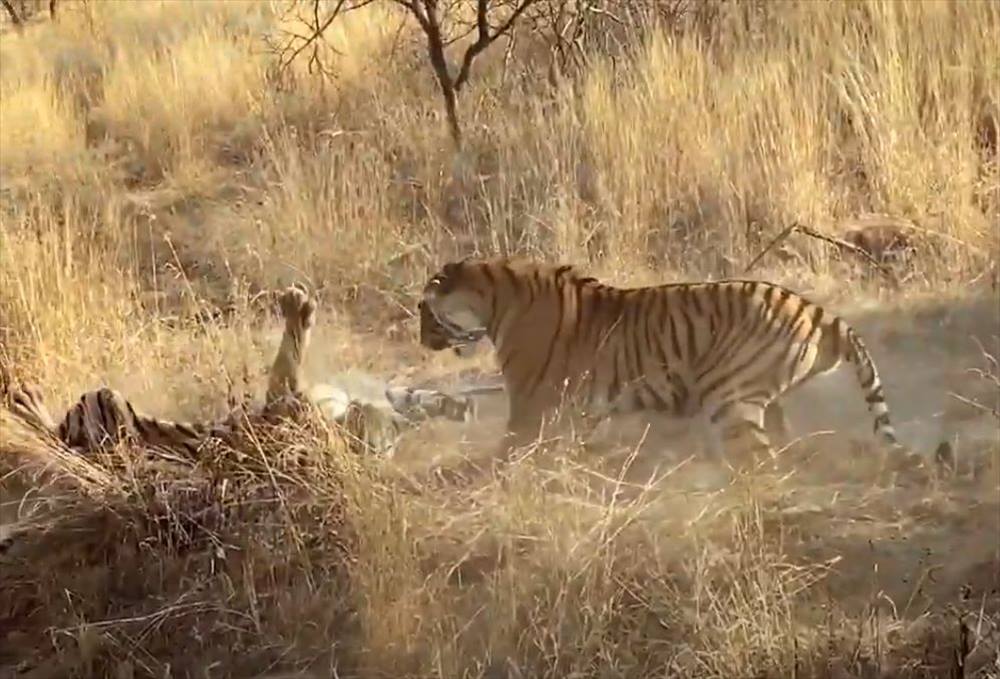 1頭のトラが轟音を立てながら、もう1頭のトラに強烈なパンチを炸裂させ、その勢いで倒します。