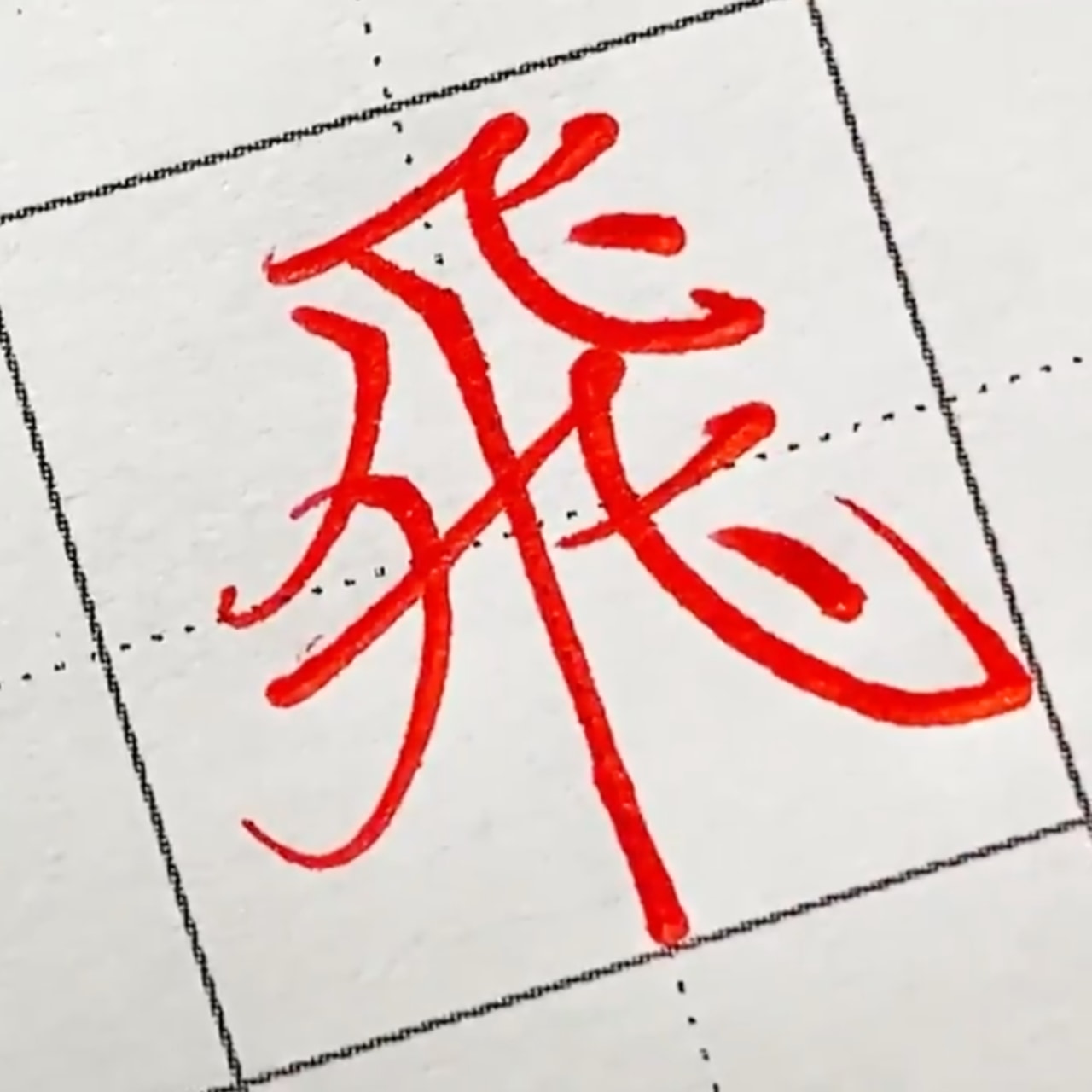 飛躍、飛翔、飛馬など、使われ方や字そのものの見た目からカッコよさがある「飛」という字。カタダさんはこれを「『飛』だけに飛んできそうな感じで」書いていきます。