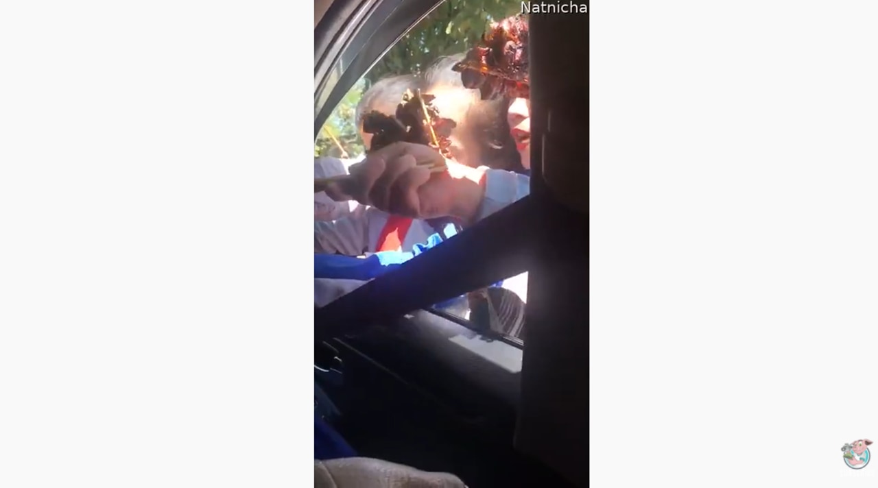 動画冒頭から5人~7人程度の女性が車の窓から「グリルチキン」を社内に突っ込んでいる様子がうかがえます。
