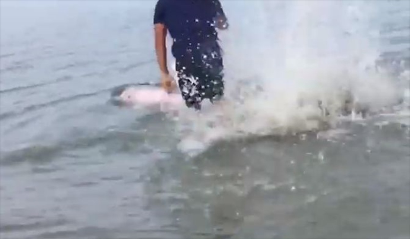 それを見た男性は同行者にカメラを預け、イルカを助けに行きます。