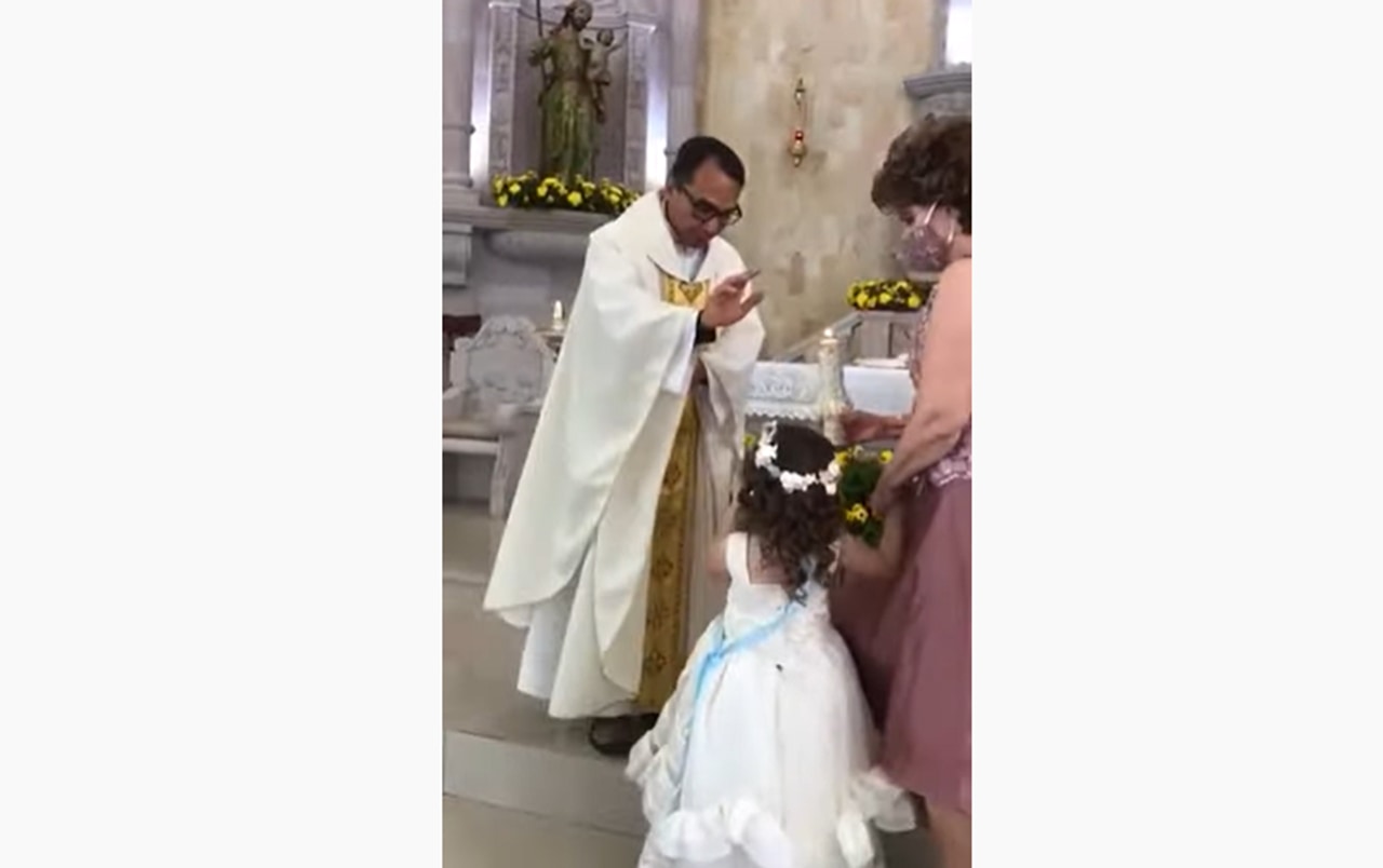 動画冒頭、司祭はお祈りの言葉を唱えながら少女に手のひらを差し出します。